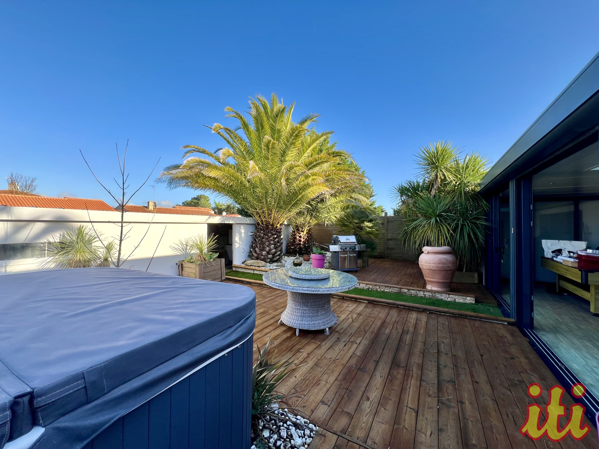À 700 m des commerces et du marché et à 6mn en vélo de la plage , dans une rue calme , très agréable maison de plain pied composée d’une cuisine ouverte de qualité, vaste pièce de vie de 72 m2 tournée sur un jardin aménagé, clos et sans vis à vis, 2 chambres dont une grande chambre avec dressing, chambre/bureau, salle d’eau, wc indépendant, buanderie, garage et dépendance. A l’extérieur vous profiterez de 2 terrasses et d’un jacuzzi.